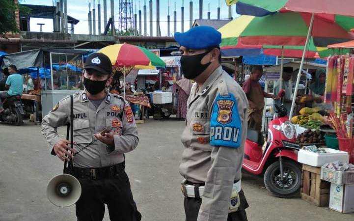 LHOKSEUMAWE- Personil Polsek Samudera melakukan Sosialisasi dan Himbauan kepada Masyarakat untuk mengunakan masker sebagai upaya pencegahan penyebaran Virus Corona di pasar sayur GDesa Mancang Kecamatan Samudera Kabupaten Aceh Utara, kamis (30/04/2020).