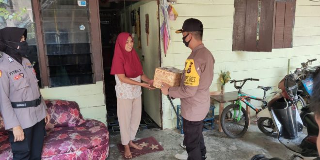 salurkan bantuan sembako Polda Aceh di Desa Meunasah Mesjid, Kec. Muara Dua, Kota Lhokseumawe, selasa (21/04/2020) pagi.