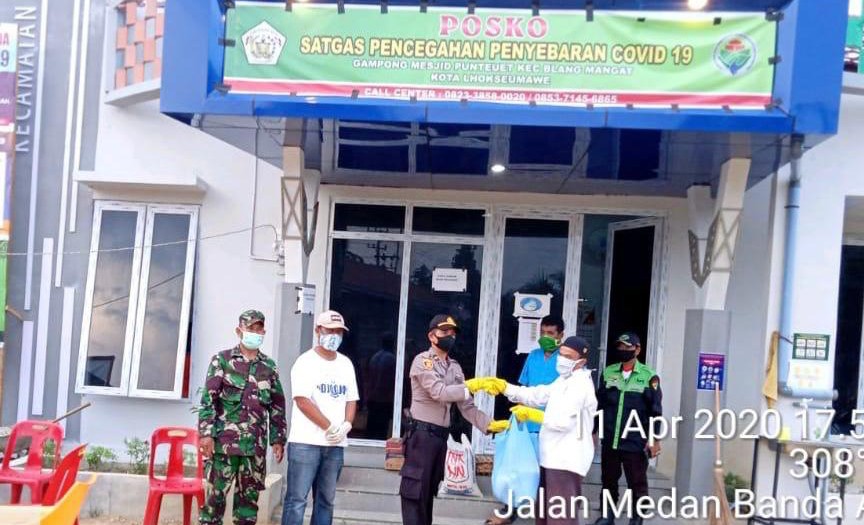 LHOKSEUMAWE- Kapolsek Blang Mangat-Forkopimca menyerahkan bantuan sembako kepada warga