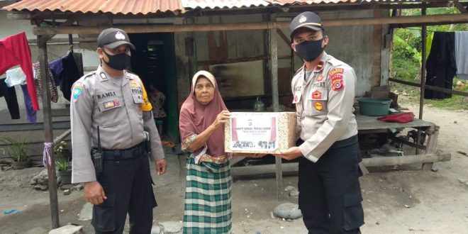LHOKSEUMAWE- Kapolsek Muara satu serahkan bantuan sosial peduli Covid 19 dari Polda Aceh dan Jajaran beserta Bhayangkari kepada Warga Fakir Miskin/Kel.pra sejahtera di Wilayah Kec. Muara Satu Kota Lhokseumawe, Selasa (21/04/ 2020).