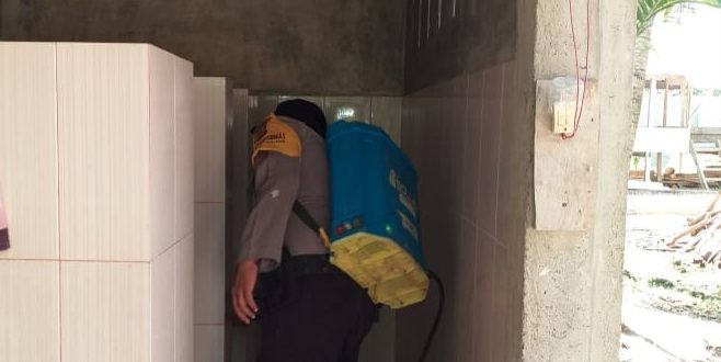 LHOKSEUMAWE- Bhabinkamtibmas Polsek Kuta Makmur Brigadir Rijalul Azis bersihkan toilet mesjid antisipasi penyabaran covid-19 dengan semprotkan Desinfektan di salah satu meunasah di kawasan Gampong Bayu, Kecamatan Kuta Makmur Kabupaten Aceh Utara, senin (06/04/2020).