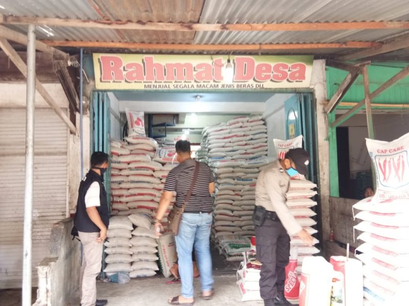 Personil Polsek Banda sakti pantau stok dan harga semboko di Toko beras Rahmat Desa di Pasar Impres, Kec. Banda Sakti, Kota Lhokseumawe dalam rangka deteksi dini mencegah kelangkaan sembako di Kota Lhokseumawe, sabtu (25/04/2020).