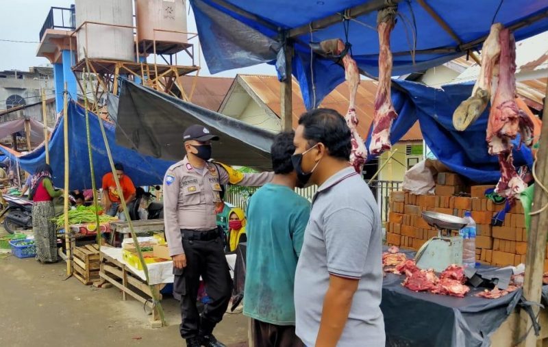LHOKSEUMAWE- Polsek Blang mangat tingkatkan patroli dialogis ke pasar Tradisional Punteut memberikan imbauan kamtibmas tentang penggunaan masker kepada masyarakat yang berbelanja keperluan tradisi meugang menghadapi bulan puasa Ramadhan, kamis (24/04/2020).