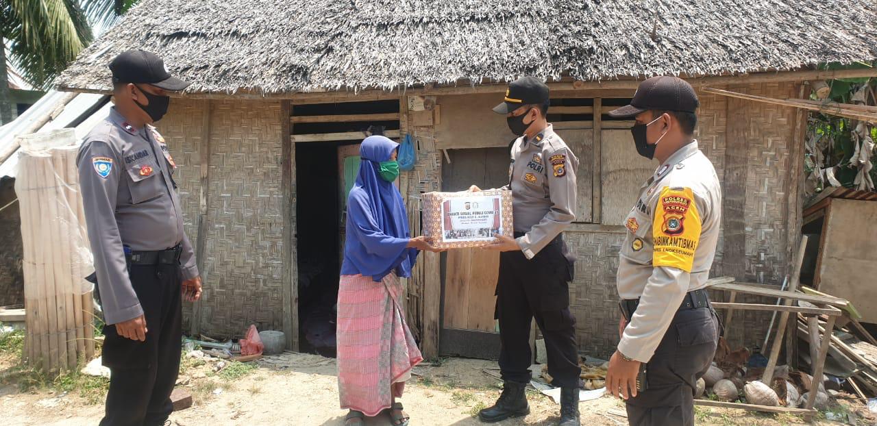 LHOKSEUMAWE- Polsek Blang Mangat berikan bantuan sosial peduli Covid 19 Polda Aceh dan Jajaran Beserta Bhayangkari kepada Warga Fakir Miskin di Wilayah Kec. Blang Mangat Kota Lhokseumawe, Selasa (21/04/2020) pagi.