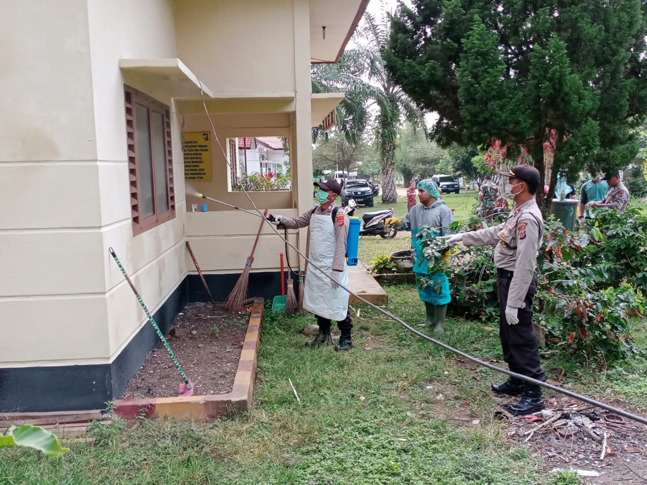 Kapolres Lhokseumawe AKBP Ari Lasta Irawan, S.Ik melalui Kasubsektor Nisam Antara IPDA Ridwan mengatakan, penyemprotan Desinfektan untuk mensterilisasi dan menetralisir penyebaran Virus Covid -19.