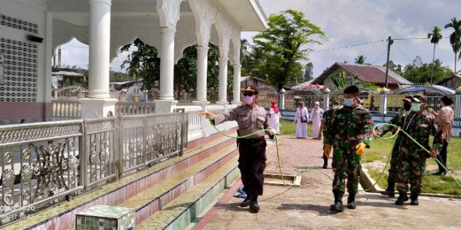 LHOKSEUMAWE- Polisi Sektor Geurudong Pase bersama TNI, petugas kesehatan, kepala Desa dan warga bersinergi gotong royong di Mesjid AL-Ansyar dalam rangka pencegahan penyebaran virus Covid-19, rabu (01/04/2020) pagi.