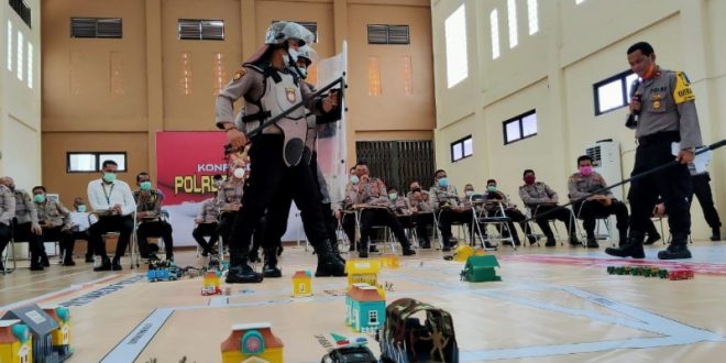 LHOKSEUMAWE – Polres Lhokseumawe menggelar tactical floor game (TFG) di Gedung Serba Guna Wira Satya Mapolres Lhokseumawe, Senin (6/4/2020).