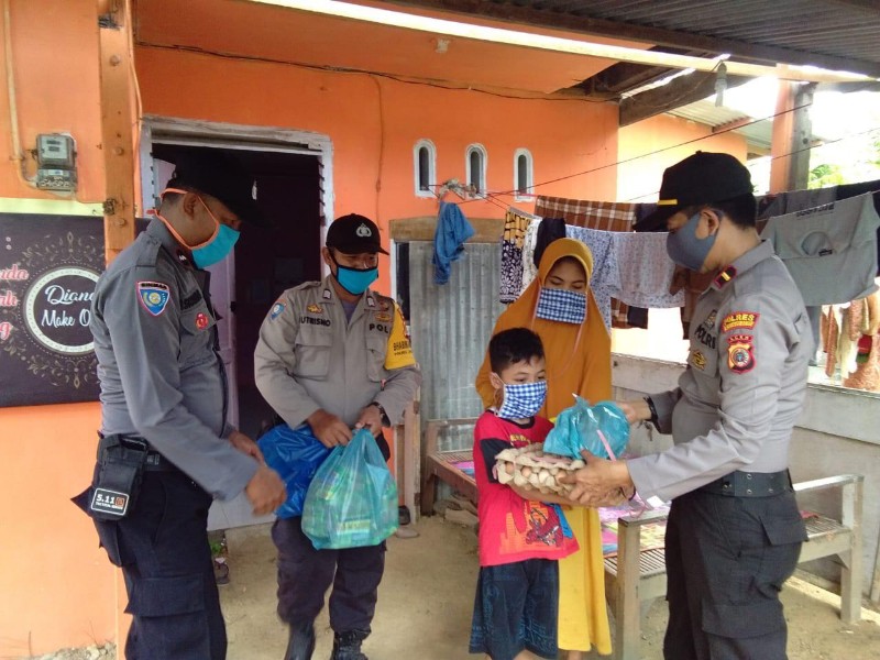 LHOKSEUMAWE- Kepolisian Resor Lhokseumawe Sektor Blang Mangat memberikan bantuan sembako kepada Anak Yatim Piatu di Desa Mesjid Punteut Kec. Blang Mangat Pemko Lhokseumawe, Rabu (15/4/2020) sore.