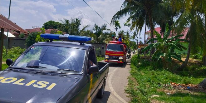 LHOKSEUMAWE- Personil Polsek Blang Mangat kawal penyemprotan Desinfektan guna mencegah penyebaran virus covid-19 di 22 Desa di tiga mukim Kec. blang Mangat, Kota Lhokseumawe, kamis (09/04/2020).