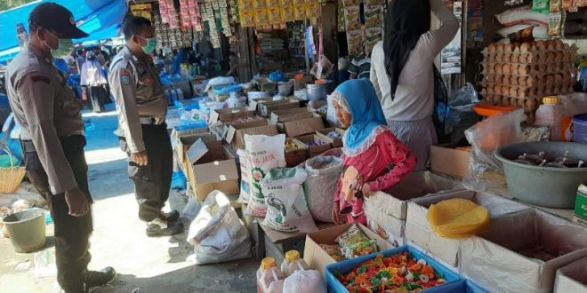 LHOKSEUMAWE- Sejumlah personil Kepolisian Resor Lhokseumawe Sektor Muara Satu (Polsek Muara Satu) memberikan imbauan kamtibmas agar para pedagang Pasar tradisional Batuphat berkativitas dengan menggunakan masker dalam rangka mencegah penyebaran virus covid-19 di wilayah Kec. Muara satu, Kota Lhokseumawe, Rabu (08/04/2020).