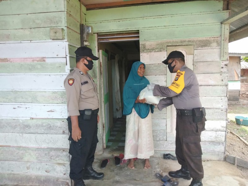 Beberapa personil Polsek turun langsung menyambangi rumah warga membawakan sejumlah bahan pokok rumah tangga dan menyerahkan menyerahkan bantuan tersebut kepada warga yang layak menerima, Jum’at (17/04/2020).