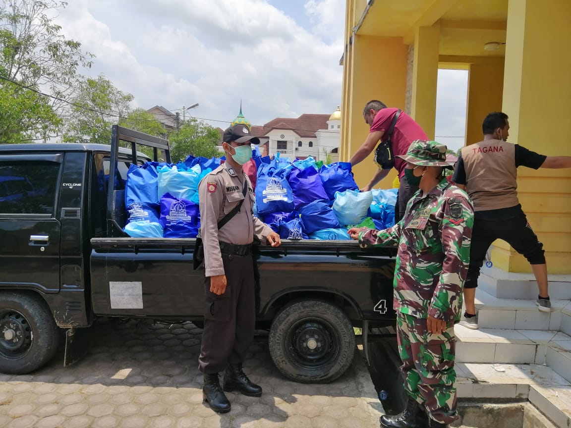 LHOKSEUMAWE- Kepolisian Resor Lhokseumawe Sektor Sawang bersama TNI setempat mengawal bantuan sembako dari Dinas Sosial, Pemberdayaan Perempuan dan Perlindungan Anak Kab. Aceh Utara untuk disalurkan kepada warga terdampak Covid-19 di kawasan Sawang, Minggu (19/04/2020).