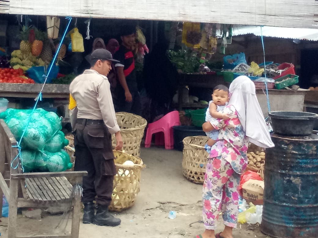LHOKSEUMAWE- Kepolisian Resor Lhokseumawe Sektor Simpang Kramat (Polsek Simpang Kramat) melakukan patroli dialogis dalam rangka mengecek ketersediaan bahan pokok dan stabilitas harga pangan di pasar tradisional Simpang Kramat Kab. Aceh Utara, Provinsi Aceh, selasa (07/04/2020).