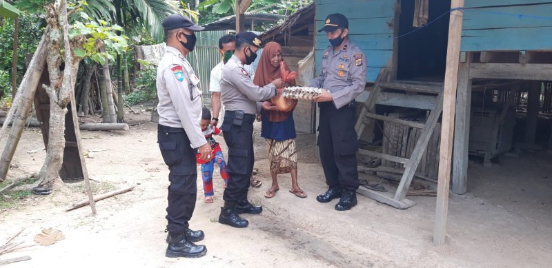LHOKSEUMAWE- Kepolisian Resor Lhokseumawe Sektor Simpang Kramat (Polsek Simpang Kramat) sambangi warga kurang mampu dan menyerahkan sejumlah bingkisan sembako di Desa Paya Leupah dan Desa Meunasah Dayah Kec. Simpang Kramat Kab. Aceh Utara, senin (13/04/2020) sore.