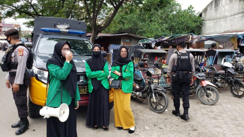 Anggota Sat Sabhara Polres Lhokseumawe dan Mahasiswi melakukan kegiatan sosialisasi pencegahan penyebaran virus covid-19 di Pasar Impres Kota Lhokseumawe, selasa (28/04/2020).