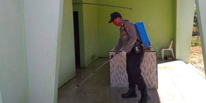 LHOKSEUMAWE- Kanit Binmas Polsek Kuta Makmur Semprotkan desinfektan yang dilakukan bersama Bhabinsa, Geuchik, petugas kesehatann dan Tim Posko tanggap siaga pananganan covid-19 yang berlangsung di Desa