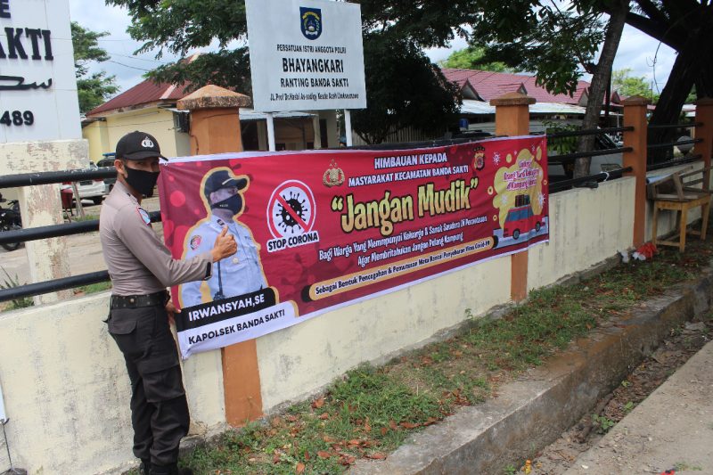 Kapolres Lhokseumawe AKBP Ari Lasta Irawan, S.I.K melalui Kapolsek Banda Sakti IPTU Irwansyah mengatakan pemasangan spanduk dilakukan di tempat-tempat strategis, agar dapat mengingatkan masyarakat agar sementara waktu ini untuk bisa menunda keinginan mudik ke kampung halaman.