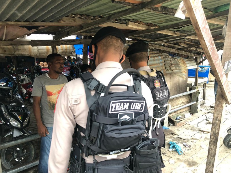 LHOKSEUMAWE- Tim URC Sabhara Polres Lhokseumawe meningkatkan patroli dengan menyambangi petugas parkir di sejumlah pasar dan tempat keramaian di Kota Lhokseumawe, selasa (26/05/2020).