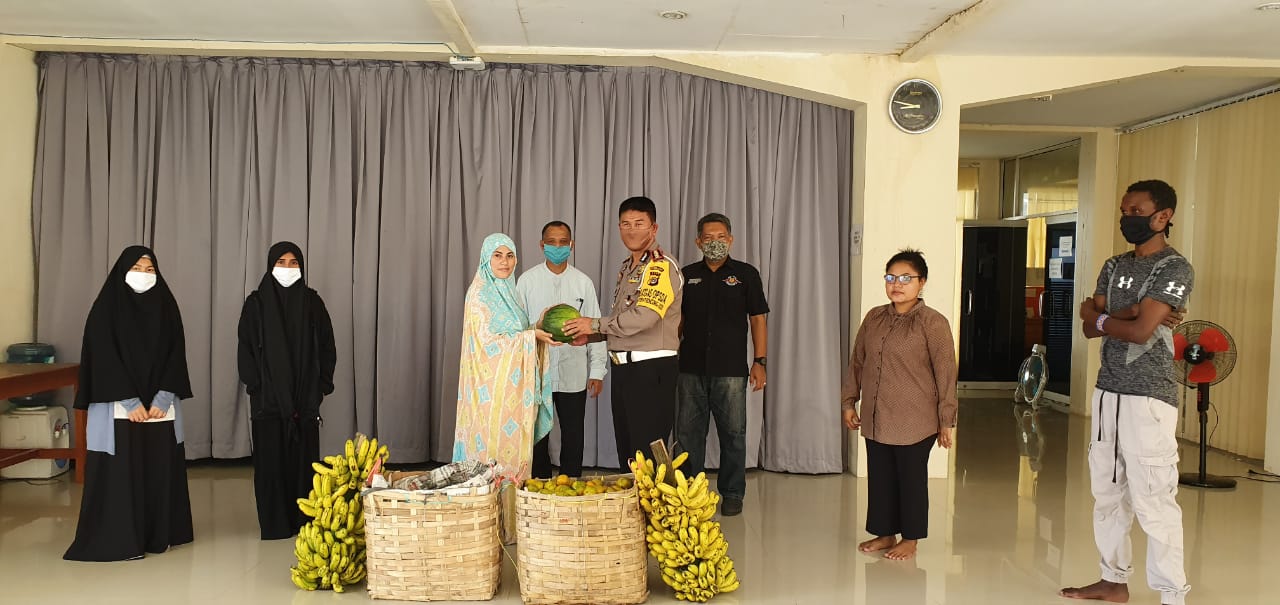 LHOKSEUMAWE-Dirlantas Polda Aceh Kombes Pol. Dicky Sondany, S. I. I., M. H, membantu mahasiswa Unsyiah Banda Aceh yang berasal dari luar negeri dan luar Aceh dengan memberi bantuan buah-buahan, Selasa (5/5)