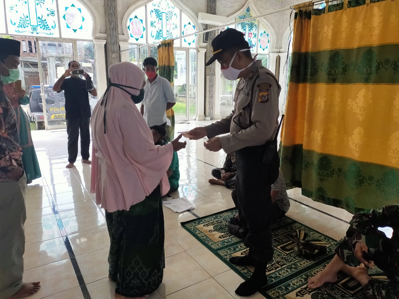 LHOKSEUMAWE- Kapolsek Dewantara saksikan dan serahkan secara simbolis penyerahan BLT Dana Desa kepada warga Desa Ulee Pulo disertai dengan penyerahan sembako dari PT. PIM di Meunasah Desa Ulee Pulo Kec Dewantara Kab Aceh Utara , Sabtu (16/05/2020) pagi.