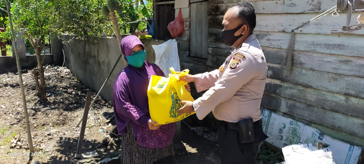 LHOKSEUMAWE- Kasubsektor Muara Dua menyerahkan Bansos kepada masyarakat fakir miskin di Wilayah hukum Kec.Muara Dua Kota Lhokseumawe, Selasa (05/05/2020) sekira pukul 10.30 Wib