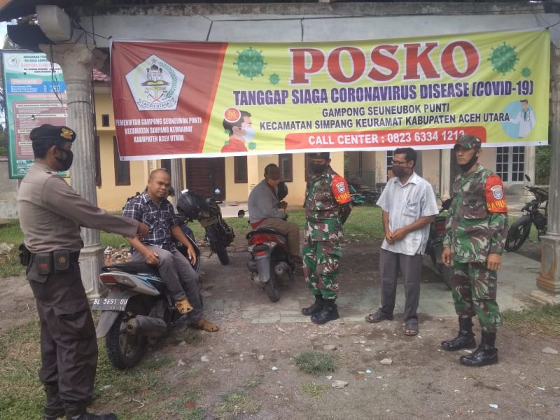 LHOKSEUMAWE- Personil Polsek Simpang Keuramat dalam hal ini Bhabinkamtibmas bersama Babinsa koramil 17 simpang keuramat kompak melaksanakan kegiatan pengecekan Pos Siaga Covid 19 yang ada di Desa Seunebok Punti Kecamatan Simpang Keuramat, Rabu (06/05/2020) pagi.