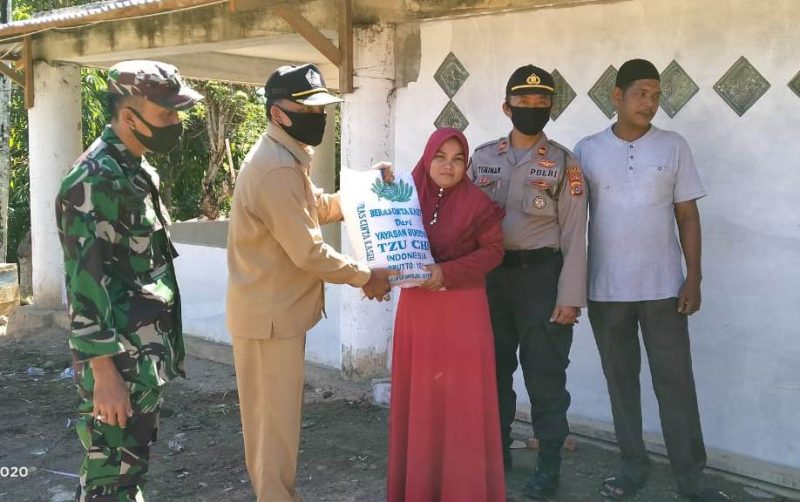 LHOKSEUMAWE- Kasubsektor Geurudong pase melakukan pengamanan pendistribusian dan penyerahan sembako dari Yayasan Buddha Tzu Chi Indonesia melalui Muspika Kec. Grd Pase Kab. Aceh Utara, Selasa (05/042020) pagi.