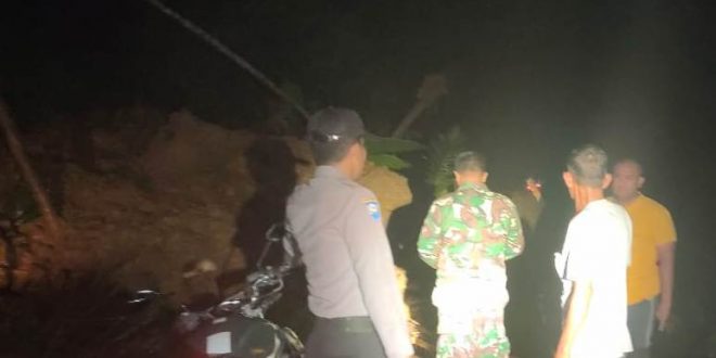 LHOKSEUMAWE – Personil Kepolisian Resor Lhokseumawe sektor Sawang pantau lokasi longsor di Desa Riseh Baroh, Kecamatan Sawang, Kabupaten Aceh Utara, Sabtu (16/05/2020) malam.