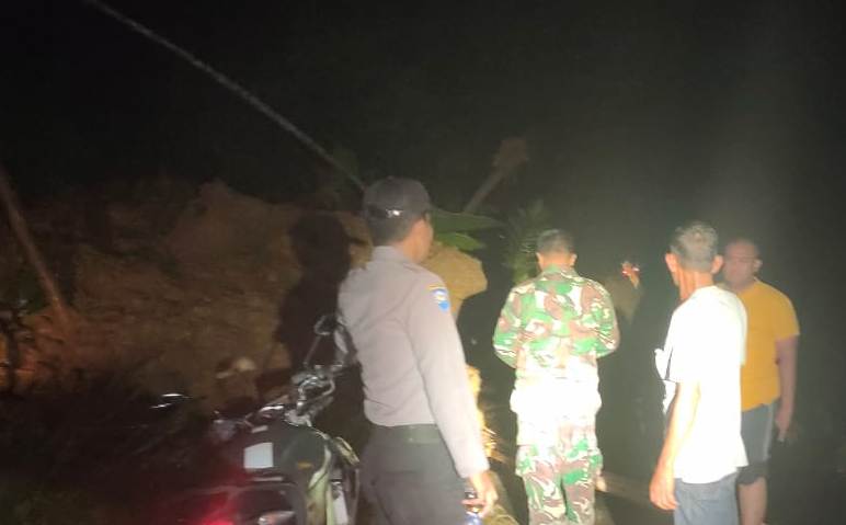 LHOKSEUMAWE – Personil Kepolisian Resor Lhokseumawe sektor Sawang pantau lokasi longsor di Desa Riseh Baroh, Kecamatan Sawang, Kabupaten Aceh Utara, Sabtu (16/05/2020) malam.