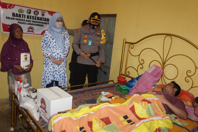 kepada personil Polres Lhkkseumawe Nuril Hadi penderita tumor yang sakit menahun di Desa Alue papen, Kec. Nisam Antara, Kab. Aceh Utara, sabtu (20/06/2020) siang.
