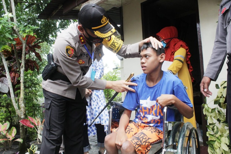 LHOKSEUMAWE- Kapolres Lhokseumawe AKBP Eko Hartanto, S.Ik, MH didampingi Ketua Bhayangkari Lhokseumawe Ny. Lily Eko Hartanto, S.I.K berikan bantuan kursi roda kepada Haikal (14 thn) serta menyerahkan bantuan semboko kepada keluarga di kawasan Bulit rata, Komplek Aspol Blang Mangat, Kota Lhokseumawe, sabtu (20/06/2020) siang.