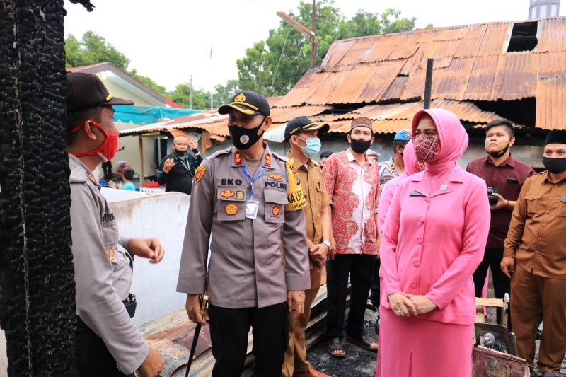 LHKKSEUMAWE- Kapolres Lhokseumawe AKBP Eko Hartanto, S.I.K. M.H dan Ibu Ketua Bhayangkari Cabang Lhokseumawe beserta Pejabat Utama polres Lhokseumawe berkunjung dan memberikan bantuan kepada personil polri penghuni Aspol Dewantara yang terdampak musibah kebakaran rumah dinas, selasa (30/06/2020)