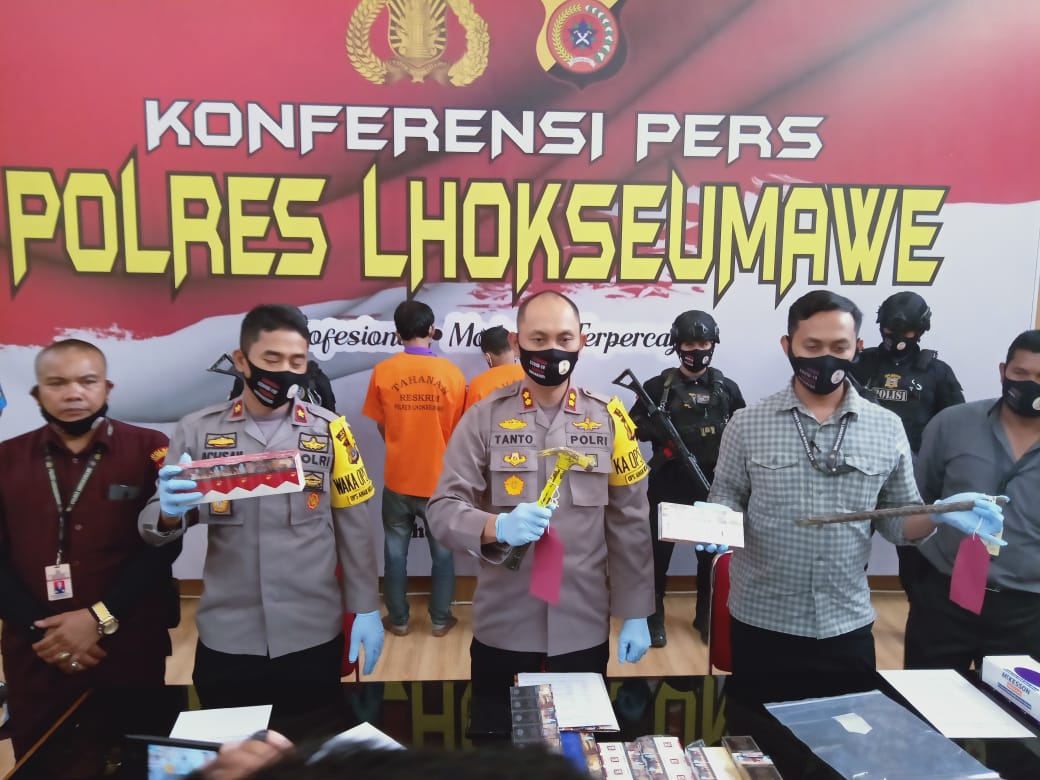 Kapolres Lhokseumawe, AKBP Eko Hartanto didampingi Wakapolres Lhokseumawe, Kompol Ahzan, dalam konferensi pers di Mapolres Lhokseumawe, Kamis (16/7/2020), mengatakan tersangka yang ditangkap itu yakni GS (30) warga Kecamatan Banda Sakti dan SM (33) warga Kecamatan Blang Mangat, Kota Lhokseumawe. Menurutnya, kedua tersangka merupakan mantan napi. GS baru keluar LP Kelas IIA Lhokseumawe, bebas karena asimilasi Covid-19 pada April 2020 dalam perkara narkotika. Sedangkan SM bebas pada 2019 terkait kasus pencurian kendaraan bermotor (curanmor).