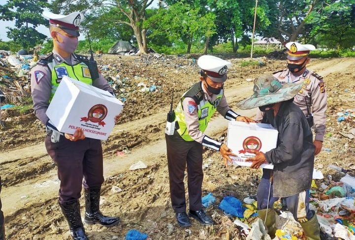 Kali ini, Satlantas membagikan paket sembako kepada masyarakat yang sehari-hari menjadi pemulung sisa limbah rumah tangga di Tempat Pembuangan Akhir (TPA) Alue Lim, Kecamatan Blang Mangat, Kota Lhokseumawe.