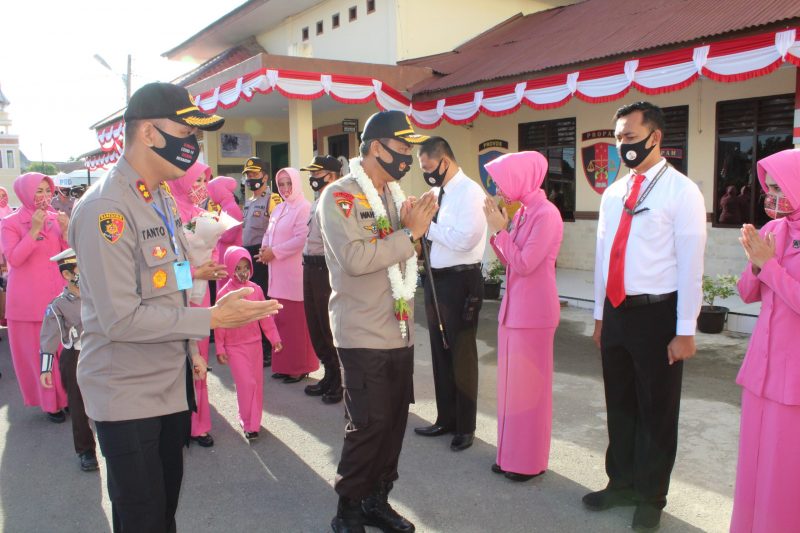 LHOKSEUMAWE- Kapolres Lhokseumawe AKBP Eko Hartanto S.Ik, MH sambut kunjungan kerja Kapolda Aceh Irjen Pol. Drs. Wahyu Widada, M. Phil beserta rombongan pejabat utama Polda Aceh serta Ketua Bhayangkari dan pengurus Bhayangkari Aceh di Mapolres Lhokseumawe, kamis (23/07/2020) pagi.