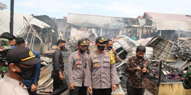 LHOKSEUMAWE- Kapolres Lhokseumawe bersama forkopimda setempat tinjau langsung lokasi kebakaran ratusan lapak pedagang di Pasar Inpres Jalan Listrik Desa Tumpok Teungoh Kecamatan Banda Sakti Kota Lhokseumawe, Kamis (09/07/2020) sekitar pukul 01.00 WIB