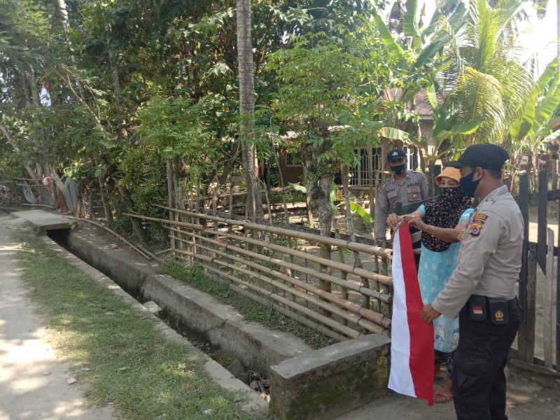 Bhabinkamtibmas tersebut juga menyediakan bendera merah putih untuk dibagikan kepada masyarakat setempat guna memperingati hari kemerdekaan Negara Republik Indonesia yang ke 75.