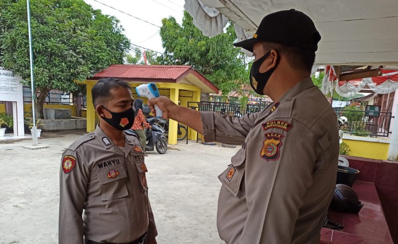 “ Hari ini kita lakukan pendisiplinan wajib menggunakan masker di lingkungan Polsek Muara Batu dengan mewajibkan penggunaan masker oleh personil dan warga yang berkunjung, selain itu personil dan warga yang masuk mako juga harus mencuci dan dilakukan pemeriksaan suhu tubuh”imbuhnya.