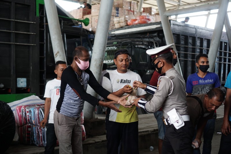 LHOKSEUMAWE- Personil Satlantas Polres Lhokseumawe membagikan puluhan nasi bungkus kepada buruh bongkar muat di kawasan terminal bongkar muat kandang Kec. Muara dua, Kota Lhokseumawe, rabu (12/08/2020).