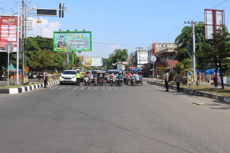 LHOKSEUMAWE- Polres Lhokseumawe kerahkan puluhan personil dititik persimpangan dalam rangka melakukan pengamanan dan pengaturan kenderaan yang berhenti sesaat sirine detik- detik Proklamasi HUT RI ke-75 menggema di Kota Lhokseumawe, senin (17/08/2020) pagi.