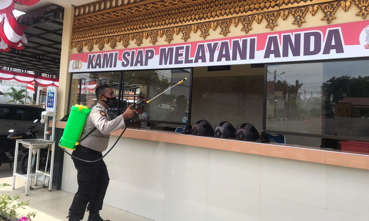 Upaya tersebut salah satunya dilakukan dengan penyemprotan disenfektan dilingkungan mako Polres dan Polsek jajaran pada sabtu (01/08/2020) pagi.