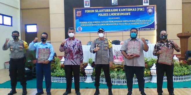 LHOKSEUMAWE – Polres Lhokseumawe menggelar acara Forum silaturrahmi kamtibmas (FSK) Polres Lhokseumawe dengan tema “peningkatan kinerja satuan pengamanan serta penerapan adaptasi kebiasaan baru dilingkungan kerja pada masa pandemi covid-19 yang berlangsung di Mapolres Lhokseumawe, rabu (30/09/2020) pagi.