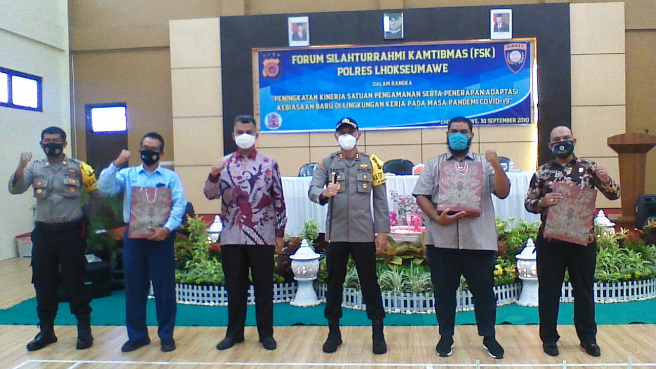 LHOKSEUMAWE – Polres Lhokseumawe menggelar acara Forum silaturrahmi kamtibmas (FSK) Polres Lhokseumawe dengan tema “peningkatan kinerja satuan pengamanan serta penerapan adaptasi kebiasaan baru dilingkungan kerja pada masa pandemi covid-19 yang berlangsung di Mapolres Lhokseumawe, rabu (30/09/2020) pagi.