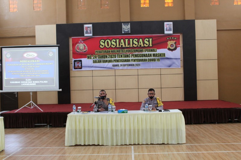 LHOKSEUMAWE – Polres Lhokseumawe mensosialisasikan Peraturan Walikota Lhokseumawe (Perwal) penggunaan masker kepada pejabat utama. Kapolsek serta perwakilan personil jajaran Polres Lhokseumawe yang berlangsung di gedung serba guna Wira Satya Polres Lhokseumawe, kamis (24/09/2020).