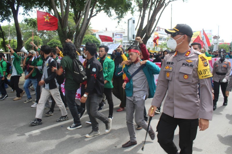 LHOKSEUMAWE- Kapolres Lhokseumawe AKBP Eko Hartanto, S.IK, MH menegaskan pengamanan aksi unjuk rasa mahasiswa terkait Omnibus Law Cipta Kerja dilakukan dengan Prefesional, Persuasif dan Humanis.