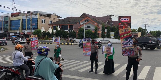 LHOKSEUMAWE- Sejumlah Polisi dari Satuan Sabhra Polres Lhokseumawe bersama Mahasiswa Unimal melakukan sosialisasi penggunaan masker dalam rangka mencegah penyebaran virus covid-19 di wilayah hukum Polres Lhokseumawe, selasa (20/10/2020) pagi.