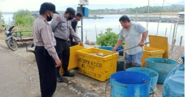 Polsek Banda Sakti mengerahkan dua personil untuk memberikan penyuluhan dan motivasi kepada petani ikan keramba di Desa binaannya dalam rangka mendukung program ketahanan pangan pemerintah di masa pendemi covid-19.