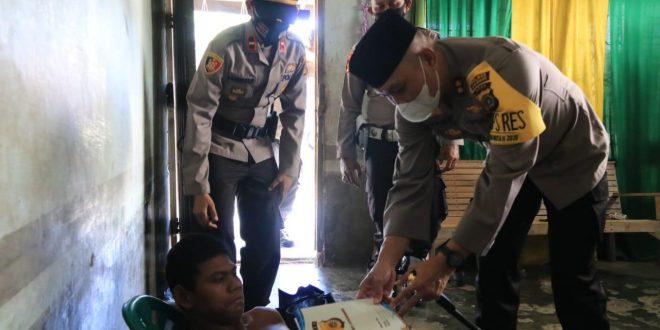 LHOKSEUMAWE – Kapolres Lhokseumawe, AKBP Eko Hartanto, Sik,MH menyalurkan bantuan kepada penyandang disabilitas di Desa Masjid Punteut, Kecamatan Blang Mangat, Kota Lhokseumawe, Selasa (17/11/2020).