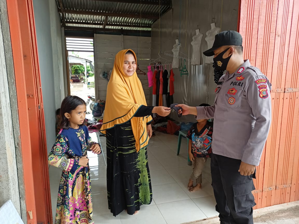 LHOKSEUMAWE – Polsek Meurah Mulia, Polres Lhokseumawe melakukan pembagian masker kepada masyarakat di Meunasah Nga, Kecamatan Meurah Mulia, Aceh Utara, Rabu (18/11/2020).