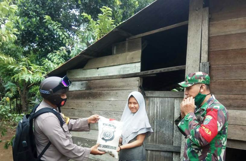 LHOKSEUMAWE – Personil Polsek Muara Batu bersama anggota Koramil Koramil 04, membagikan sembako kepada masyarakat di Gampong Meunasah Lhok, Kecamatan setempat Kabupaten Aceh Utara, wilayah hukum Polres Lhokseumawe, Selasa (17/11)